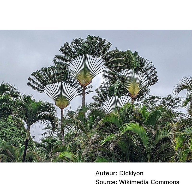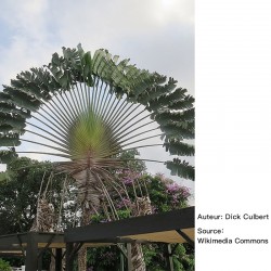 le fameux Arbre du Voyageur, n’est ni un arbre ni un palmier. C’est une plante (une légume) tropicale, qui appartient à la famille des Strelitzia. Elle est, comme l’indique son nom, originaire du Madagascar, mais à présent elle est cultivée dans beaucoup de pays chauds pour sa valeur décorative. Elle produit des belles fleurs blanches, qui ajoutent à son attractivité. Grâce à sa stipe immense elle peut atteindre 20 m de haut. La Ravenala aime bien les sols humides.