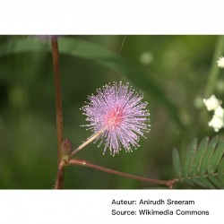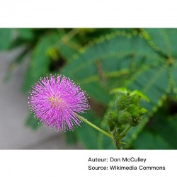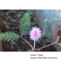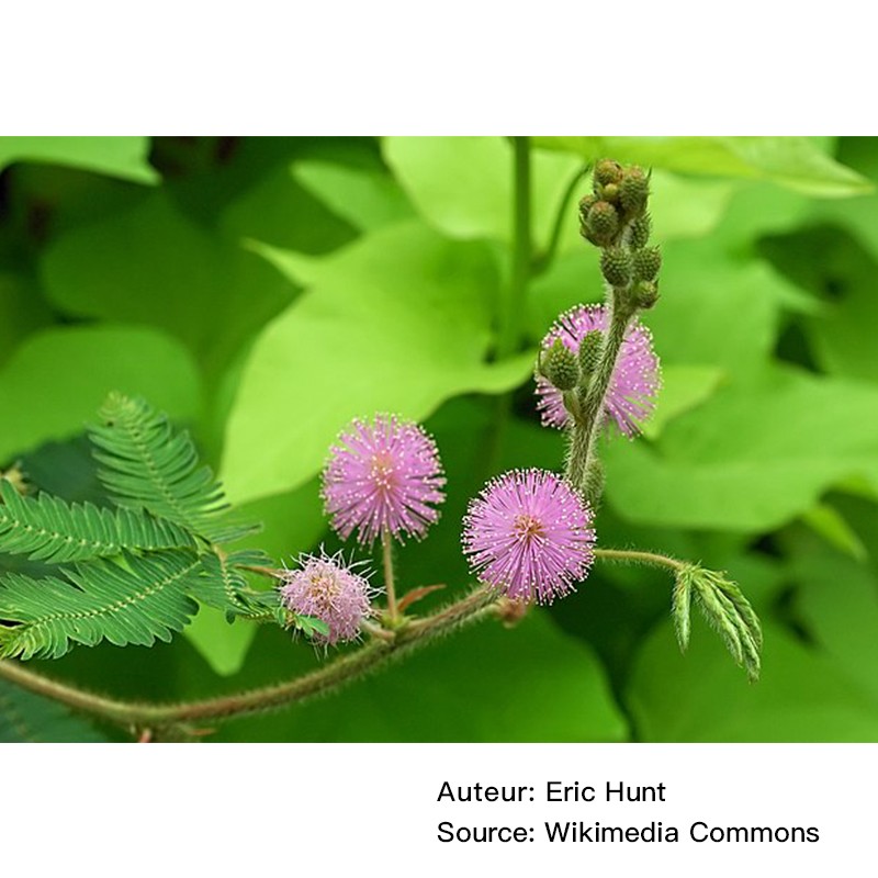est une plante rampante originaire de l’Amérique tropical et entre temps naturalisée dans le monde entier. Cette herbe à base ligneuse atteint jusqu’à 60-90 cm de haut. Plus elle vieillit plus elle développe des épines. Ses feuilles se replient quand quelquechose les touche: Le vent, la pluie, un animal…Ces mouvements rapides de repli des folioles, des feuilles et de la plante entière sont un phénomène impressionnant bien étudié.